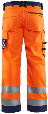 Lenkit, joista toisessa D-lenkki. Henkilökorttitasku. Napillinen puukkopidike. Kaksi lenkkiä tarranauhoilla sivuilla vasarapidikkeelle. Takataskut palkeella, vahvistetut ja läpälliset. Reisitasku, jossa kynätasku ja puhelintasku. Polvisuojataskut, jotka sopivat Blåkläderin polvisuojiin. Viistot sisätaskut. Puhelintasku. Mittatasku puukkpidikkeella ja kynätasku. Cordura-vahvistetut polvet ja taskut. C-koot voidaan pidentää C150-kooksi.