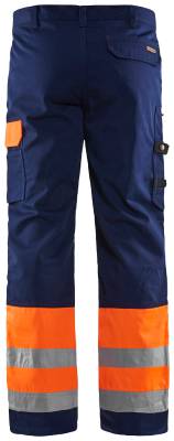 Kaksi etutaskua. Paljetakataskut. Mittatasku lisätaskulla ja puukkolenkillä. Reisitasku kynätaskulla ja puhelintaskulla. Polvisuojataskut sisäpuolella. Metallivetoketju. D-rengas. ID-henkilökorttitasku. Fluoresoivat värit. 65 mm heijastimet.