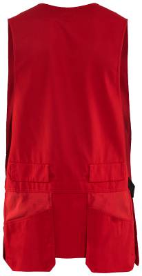 Kaksi riippuvaa rintataskua turvanauhalla, toisessa puhelintasku, toisessa patenttinapit ja veitsipidike. Vahvistetut kolmiosaiset naulataskut edessä ja leveät vahvistetut naulataskut takana. Metallinen piilovetoketju. Pidennetty selkäkappale. Henkilökorttitasku.