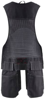 Kaksi rintataskua, toisessa läppä ja puhelintasku, toisessa kynätasku. Veitsinappi. Kaksi vahvistettua naulataskua, kaksi läpällistä meisselitaskua. Vetoketju. Säädettävä rinnanleveys. Henkilökorttitasku. Pesty.
