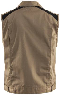 Liivi, jossa kontrastiväriset tereet ja yksityiskohdat. Kaksi läpällistä laskosrintataskua, toisessa kaksiosainen kynätasku ja lenkki muille työkaluille. Kaksi sivutaskua. Selkälaskos antaa lisää liikkumatilaa. Säädettävä helma. Painonapeilla suljettava suojalista vetoketjun päällä. Kaksi sisätaskua, sisäpuolinen puhelintasku.