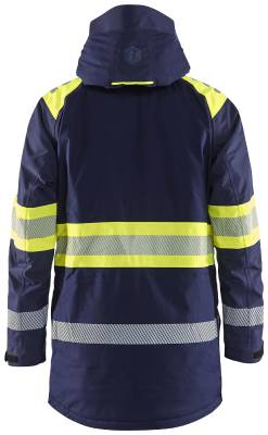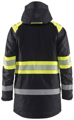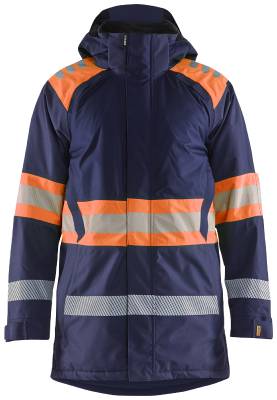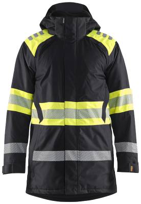 Luokan 1 huomioparkatakki talvikäyttöön. Takin malli ja tikattu vuori lämmittävät ja helpottavat työskentelyä. Veden- ja tuulenpitävä, teipatut saumat. Takissa on vahvikkeet edessä ja hihoissa. Tilava ja hyvin istuva, selkäosan stretchmateriaali lisää käyttömukavuutta. Voidaan säätää vyötäröltä, sivuilla on käyttöä helpottava vetoketju, ei rajoita liikettä polvillaan tai kyykyssä työskenneltäessä. Irrotettava huppu sopii käytettäväksi kypärän ja kuulonsuojaimien kanssa.