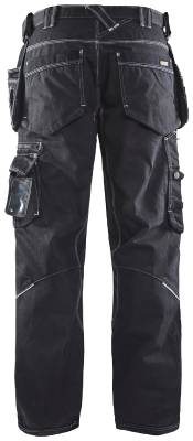 Kaksi ekstra leveää työkalutaskua, vahvistettu Cordura 1000:lla, työkalulenkit ja ekstra työkalupidike. Sivutaskut, vasemmalla puolella ekstratasku vetoketjulla. Kaksi Cordura 1000-vahvistettua takataskua palkeella. Napit sepaluksessa. Vahvistettu leveä mittanauhatasku kynätaskulla ja kaksoispuukkopidikkeellä. Reisitasku puhelintaskula, sisäänvedettävä henkilökorttitasku, kynätasku ja ekstra tilava tasku vetoketjulla. Cordura 1000-vahvistetut polvisuojataskut, joihin voi sijoittaa polvisuojat, tarranauhakiinnitys. D-lenkki edessä. Leveät lenkit. Sivuilla lenkit tarranauhalla vasarapidikkeelle (tuotenro 4020 myydään erikseen). Muotoillut lahkeet.. Cordura 1000-vahvistetut lahkeensuut säätönyörillä.