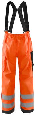 Vetoketju vyötäröllä. Henkselit. Paikat naulataskuille. Mittatasku reisitaskussa. Vahvistetut polvet. Vetoketjut lahkeissa. Säädettävät lahkeensuut. Heijastimet edessä ja takaa.