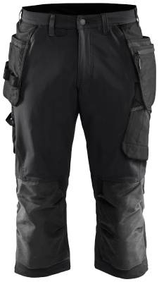 - Polvisuojatasku Cordura-stretchiä, aukko alareunassa, riipputaskut, joista toisessa vetoketju, takataskut laskoksella, mittatasku ja vasaralenkit oikealla ja vasemmalla puolella.