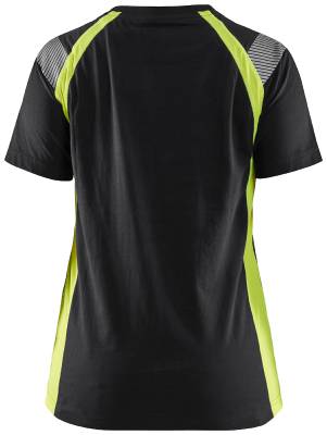 Näkyvä t-paita naisille, 100 % erittäin mukavaa puuvillaa. T-paidan heijastimet ja huomioalueet lisäävät näkyvyyttä. Puseron tumma kangas on 100 % puuvillaa, huomiokangas 100 % polyesteriä. Hyväksynnät: varoitusvaatehyväksyntä ei sovellettavissa. Pyöreä pääntie. Huomiopaneelit, lisäävät näkymistä. Naisten malli.