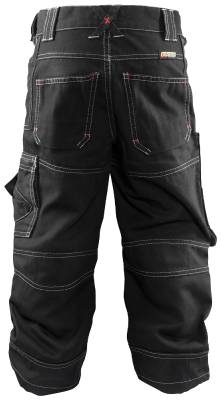 Kaksi riipputaskua, jotka voidaan laittaa housujen sisäpuolelle. Takana kaksi paljetakataskua. Vahva vetoketju edessä. Vahvistettu mittatasku, jossa kynätasku. Reisitasku vettähylkivästä materiaalista. CORDURA -polvisuojataskut. Blåkläder asennetta ja tyyliä lapsille. Esipesty.